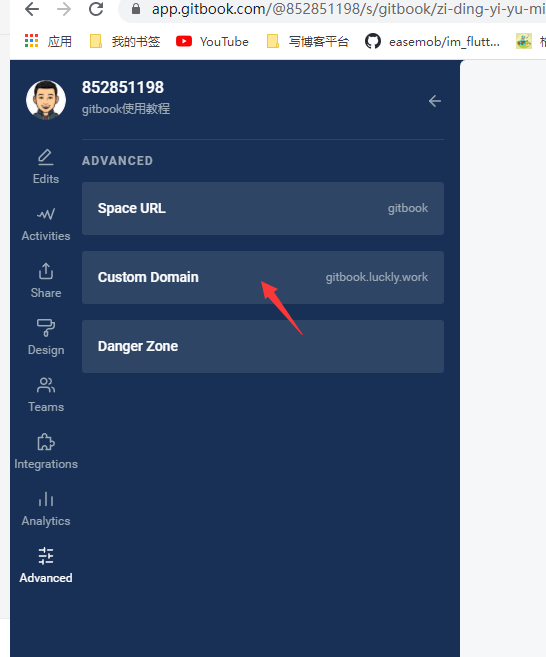 但是你也可以使用你自定义的域名(GitBook的免费功能)。域名可以绑定到你的主页或者内容上(或两者都)。